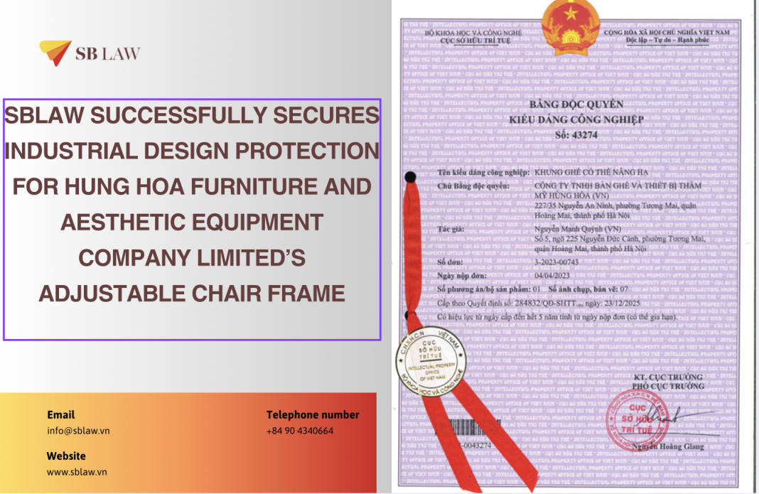 SBLAW is proud to have successfully assisted Hung Hoa Furniture and Aesthetic Equipment Company Limited in securing Industrial Design protection for their innovative Adjustable Chair Frame.